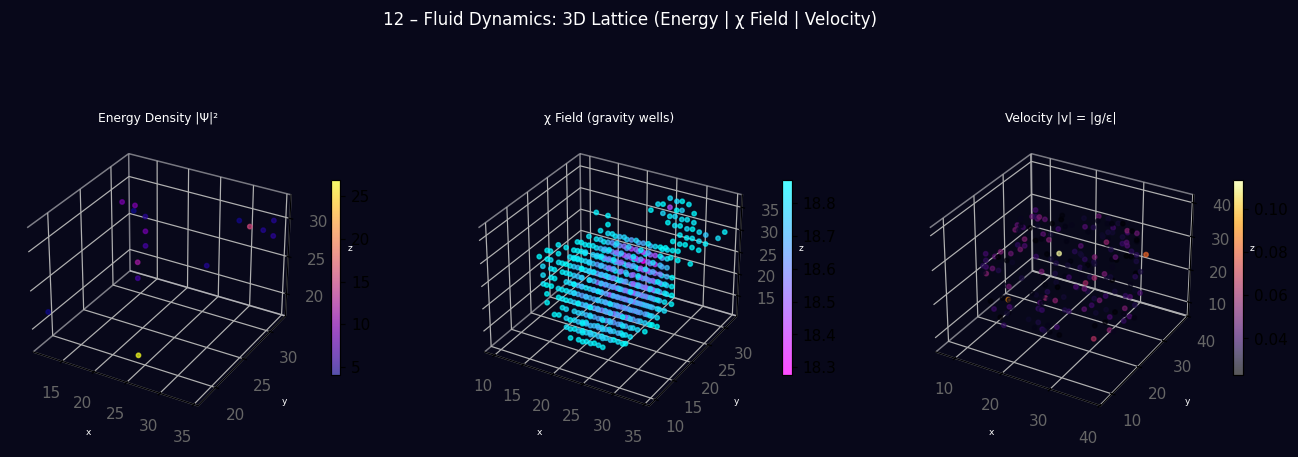 _fig.suptitle("12 – Fluid Dynamics: 3D Lattice (Energy | χ Field | Velocity)",